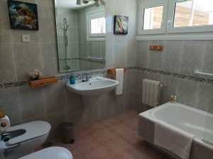 - Baño con ducha de 120 cm, lavabo e inodoro con ducha higiénica.