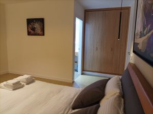 - Dormitorio 1: Cama de 150 cm, mesa de trabajo plegable, baño en suite con ducha de 140 cm, lavabo, inodoro con ducha higiénica y ventana de ojo de buey, vistas al jardín, televisión y armario empotrado.