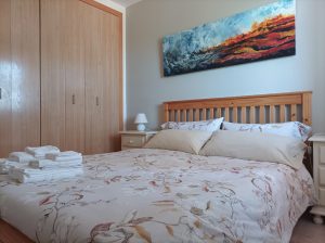 - Dormitorio 3: Dos camas de 90 cm con armario empotrado y vistas al jardín.