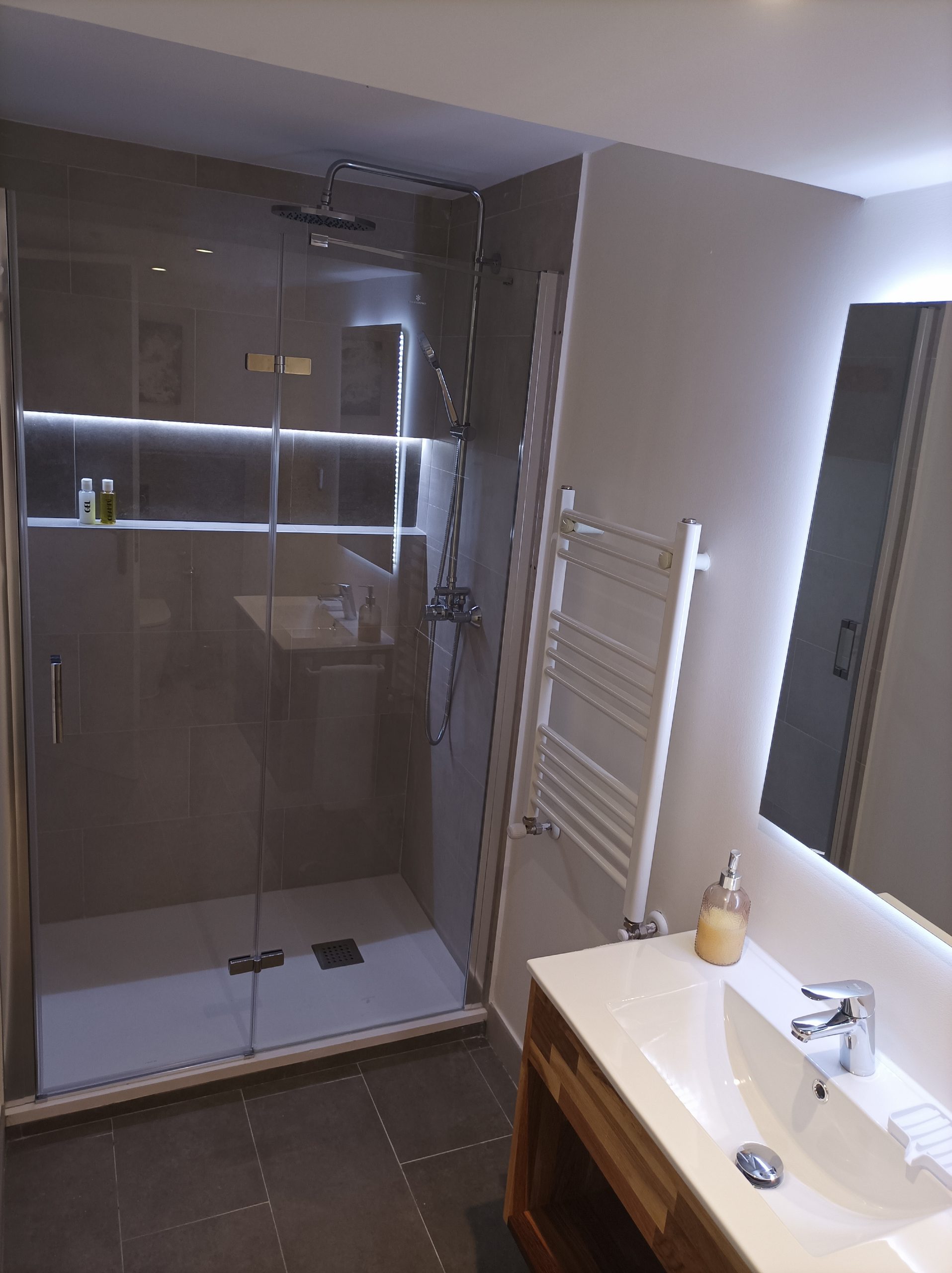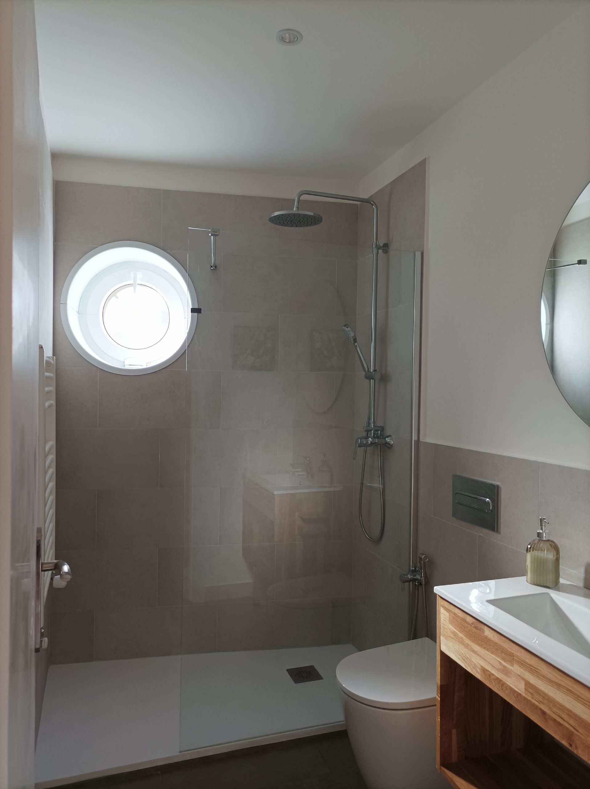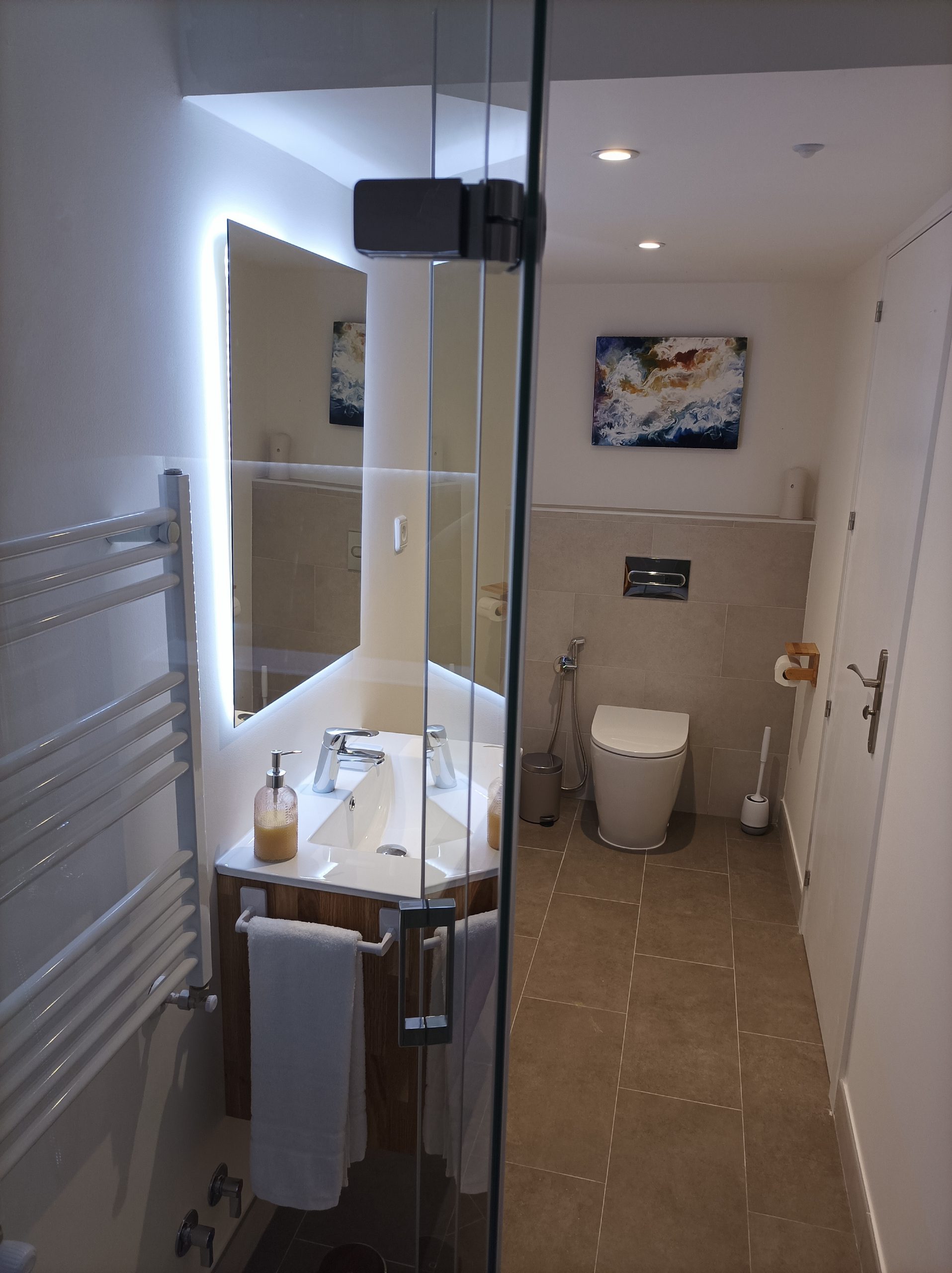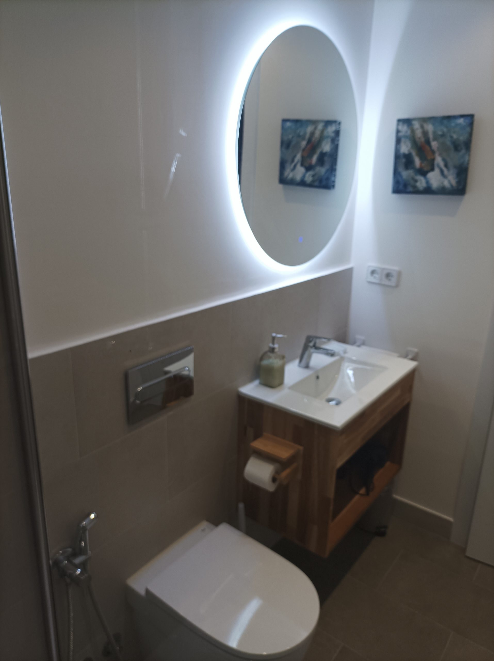 - Baño con ducha de 120 cm, lavabo e inodoro con ducha higiénica.