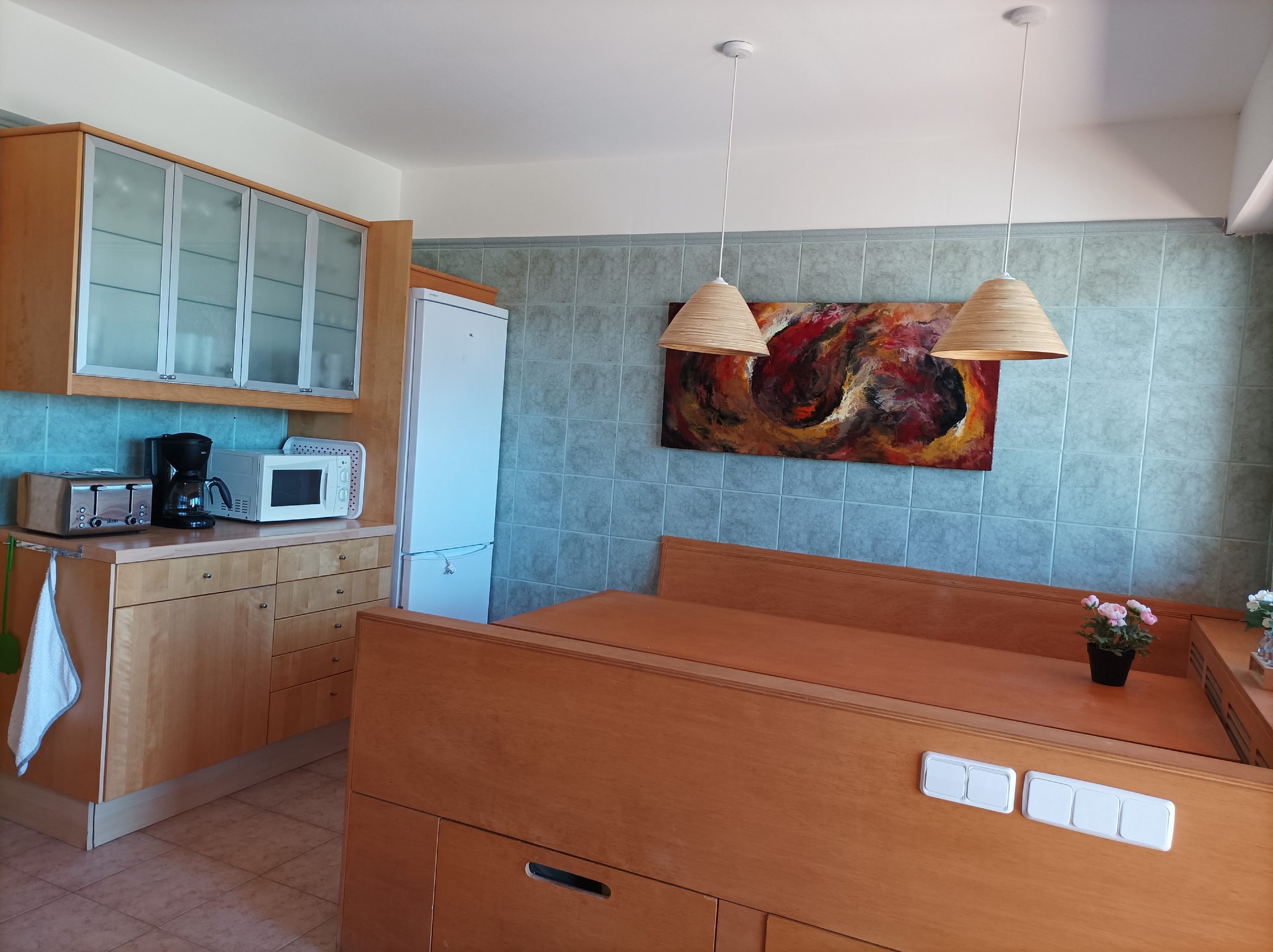 - Cocina con mesa rinconera, electrodomésticos, tostadora, hervidor de agua, cafetera y demás menaje de cocina para que se pueda cocinar como en casa.