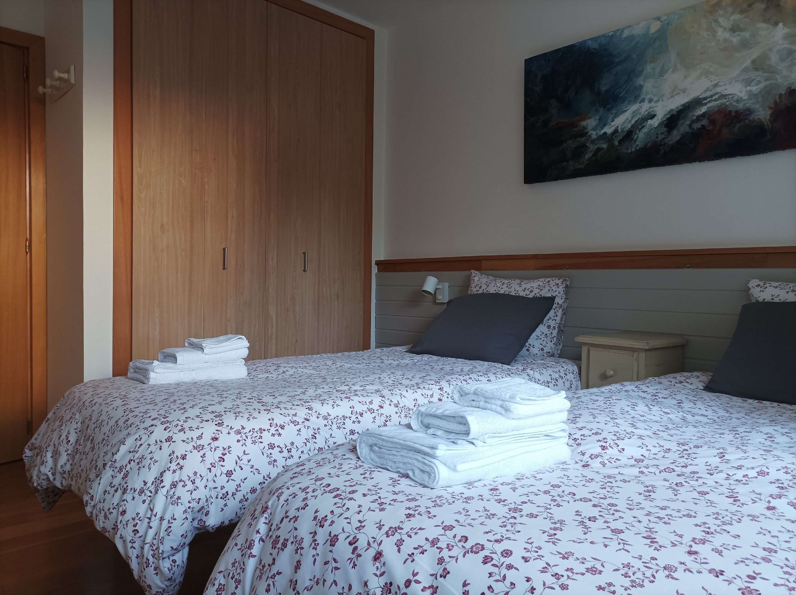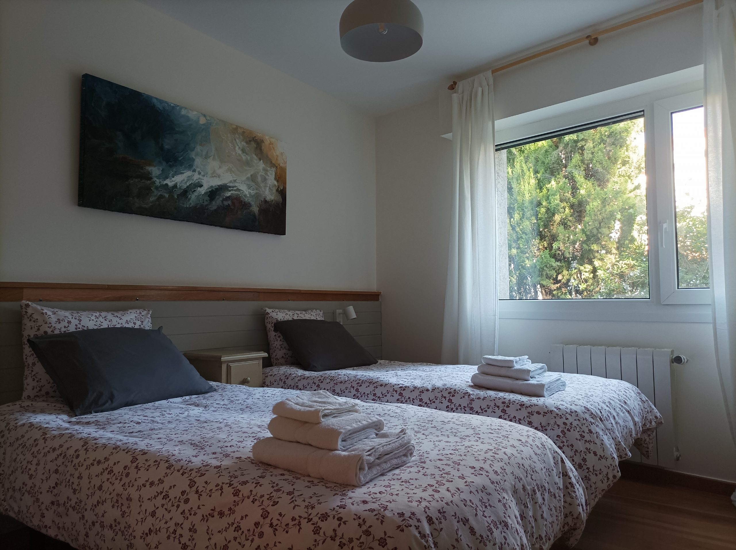 - Dormitorio 3: Dos camas de 90 cm con armario empotrado y vistas al jardín.