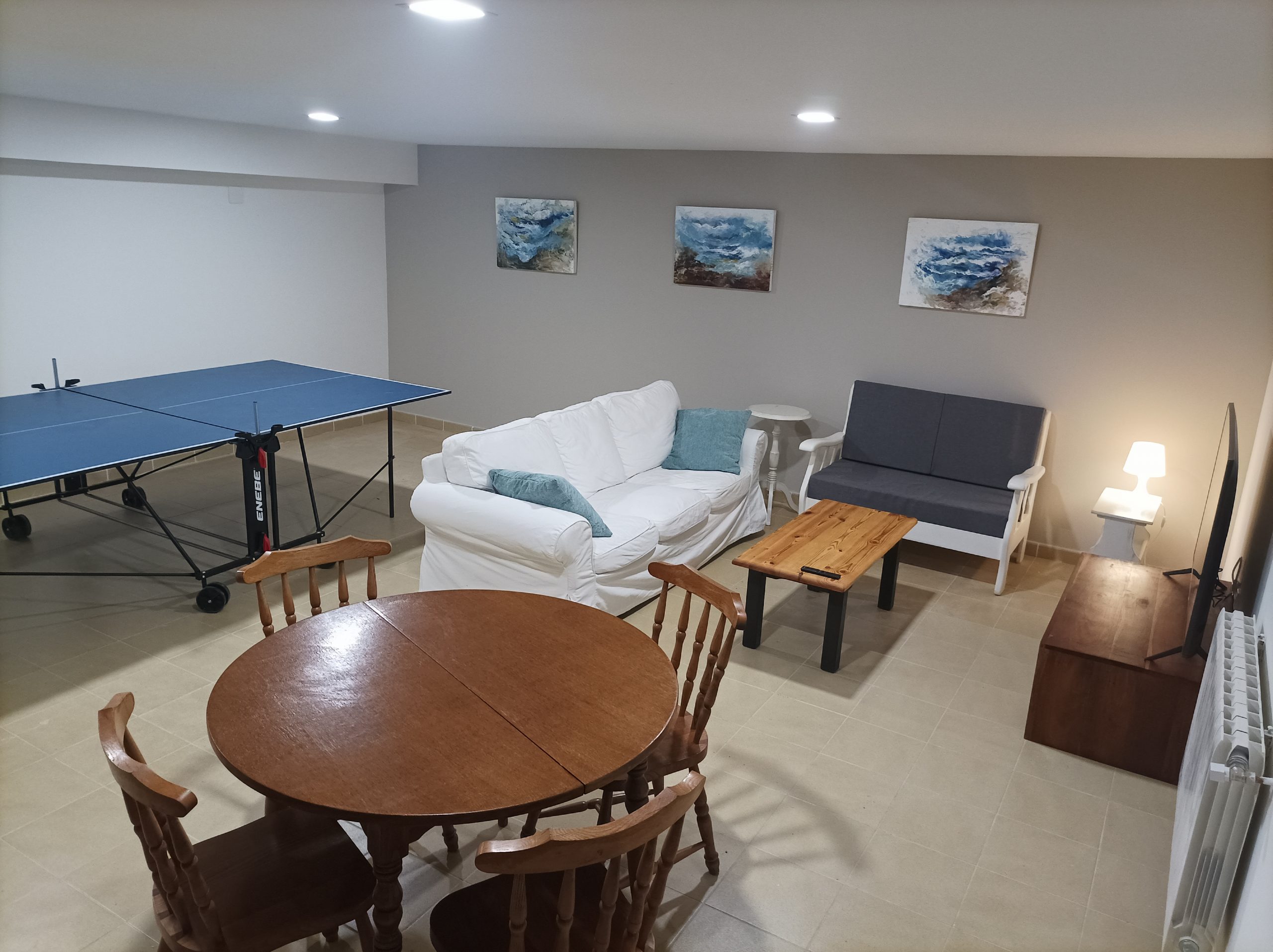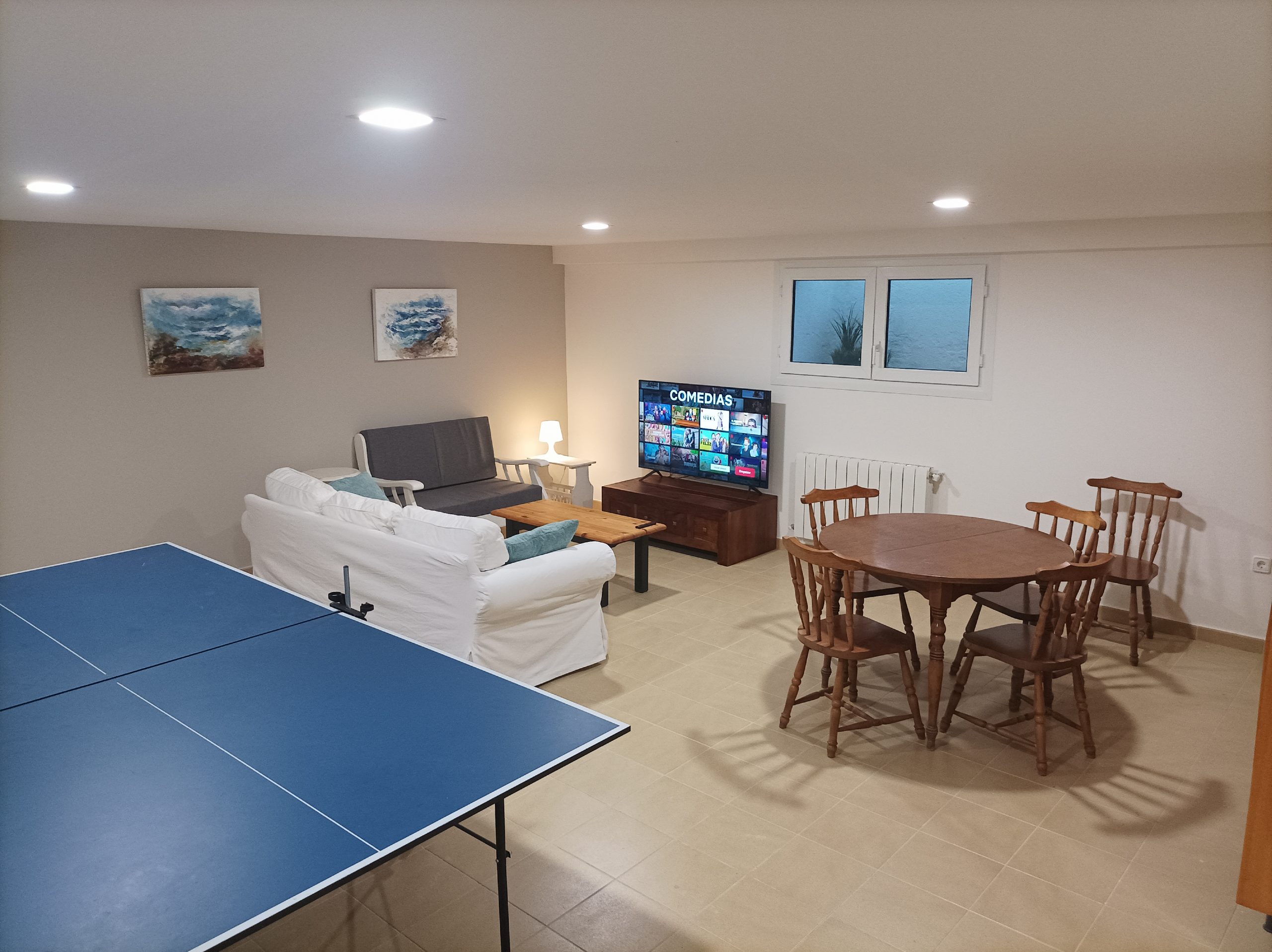 - Sala de Ocio/Dormitorio de 38 m² para los más jóvenes. Cuenta con una mesa de comedor, una mesa de ping pong, un rincón con dos sofás y una televisión de 52 pulgadas, un armario y dos camas abatibles horizontales de 90 cm. Tiene una ventana por donde recibe luz y ventilación desde la terraza de la planta superior.